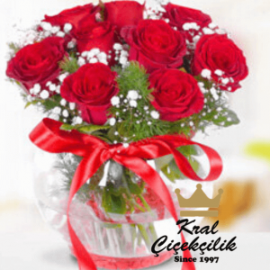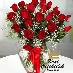 Şeffaf kalp vazo içinde 20 adet kırmızı gül