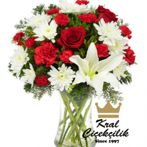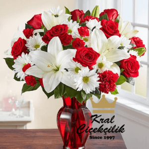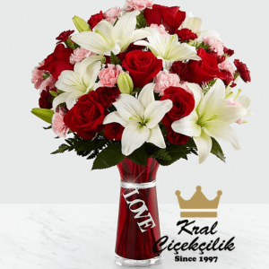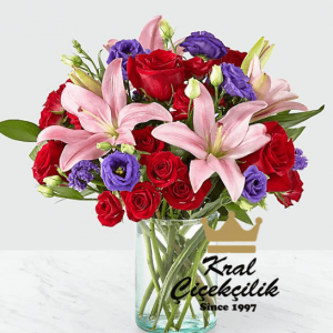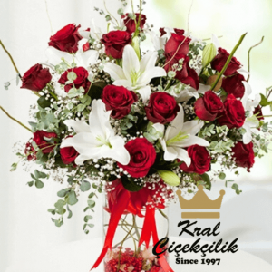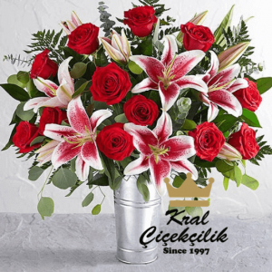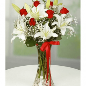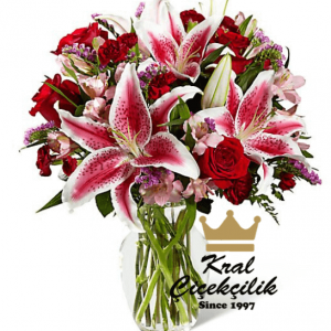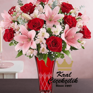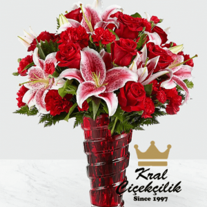 Kırmızı Vazo da Lilyum ve Kırmızı Güller