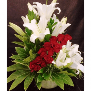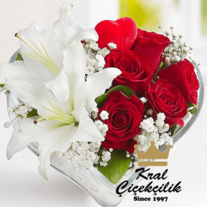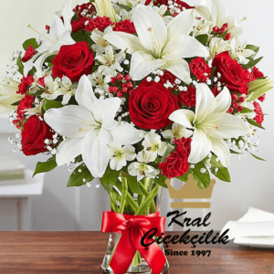 Lilyum ve kırmızı gülden oluşan şık aranjman