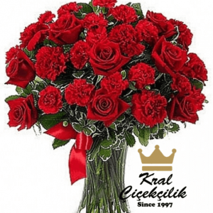 Vazo içerisinde kırmızı gül ve karanfiller