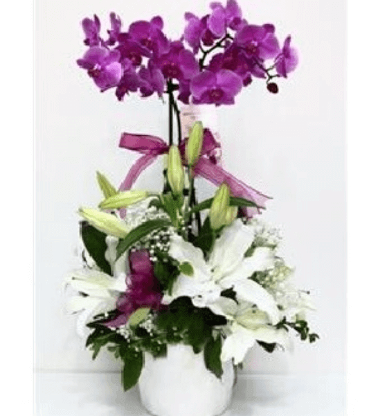 *Çift Dallı Mor Orkide Lilyum Gül Aranjmanı